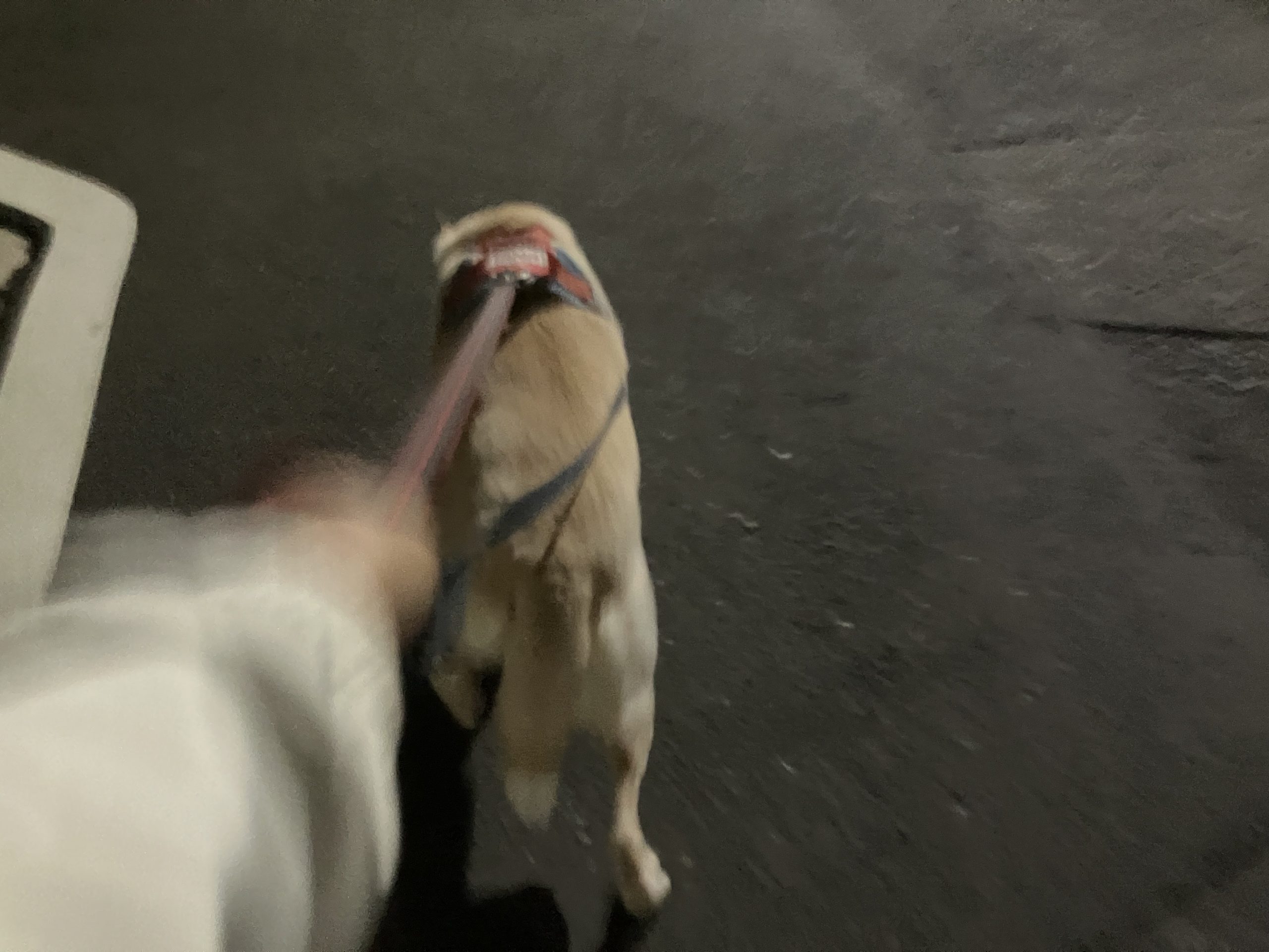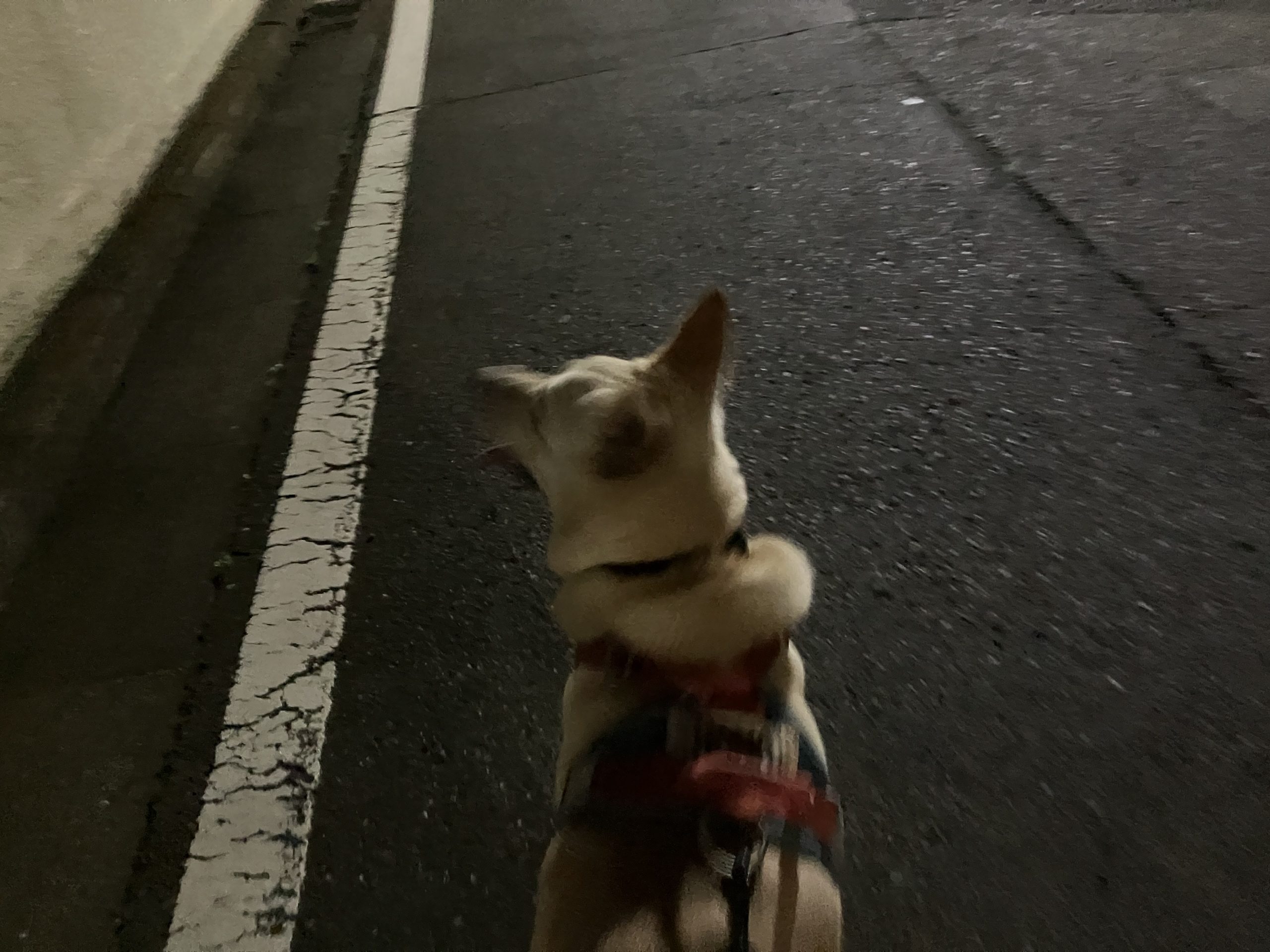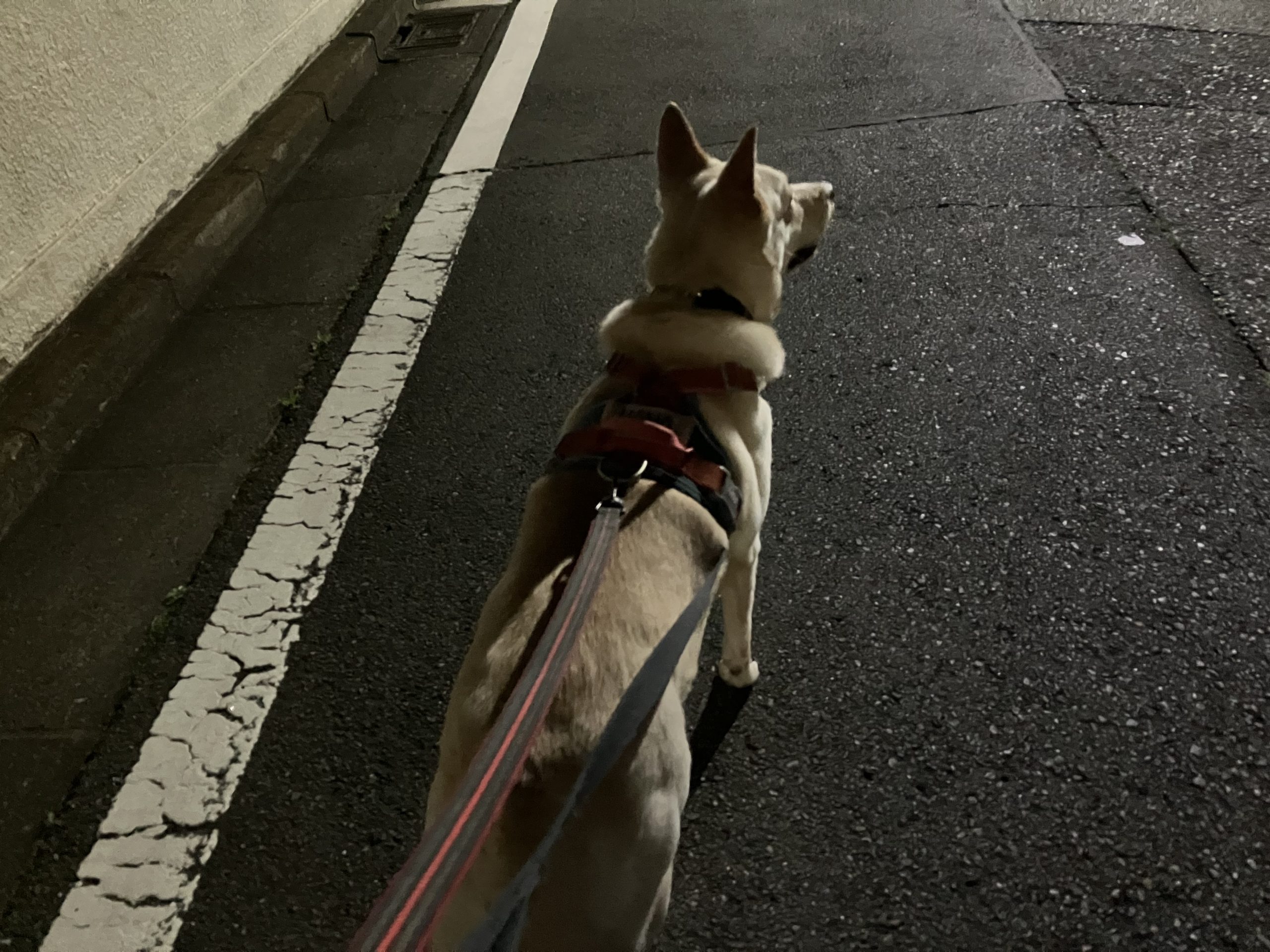 【ハナ*うちに来て4年69日目】いつもパニック夜散歩 ハナの日々 2025.04.15 夜の散歩、前方に逸ちゃん?? って思っているかもしれないハナです。違うんですけどね。この辺は一番急な坂道なのでパニクって引っ張ってくれると私はとってもラクチンです。 こちら、引っ張ってくれているハナです(;^_^A 本当にすごい力持ちです。 今日は気温がちょうどいい感じ。週末には気温が29度とか天気予報で言っていますが本当でしょうか。。お出かけの予定があるので服装に迷います。(ハナはお出かけしません)