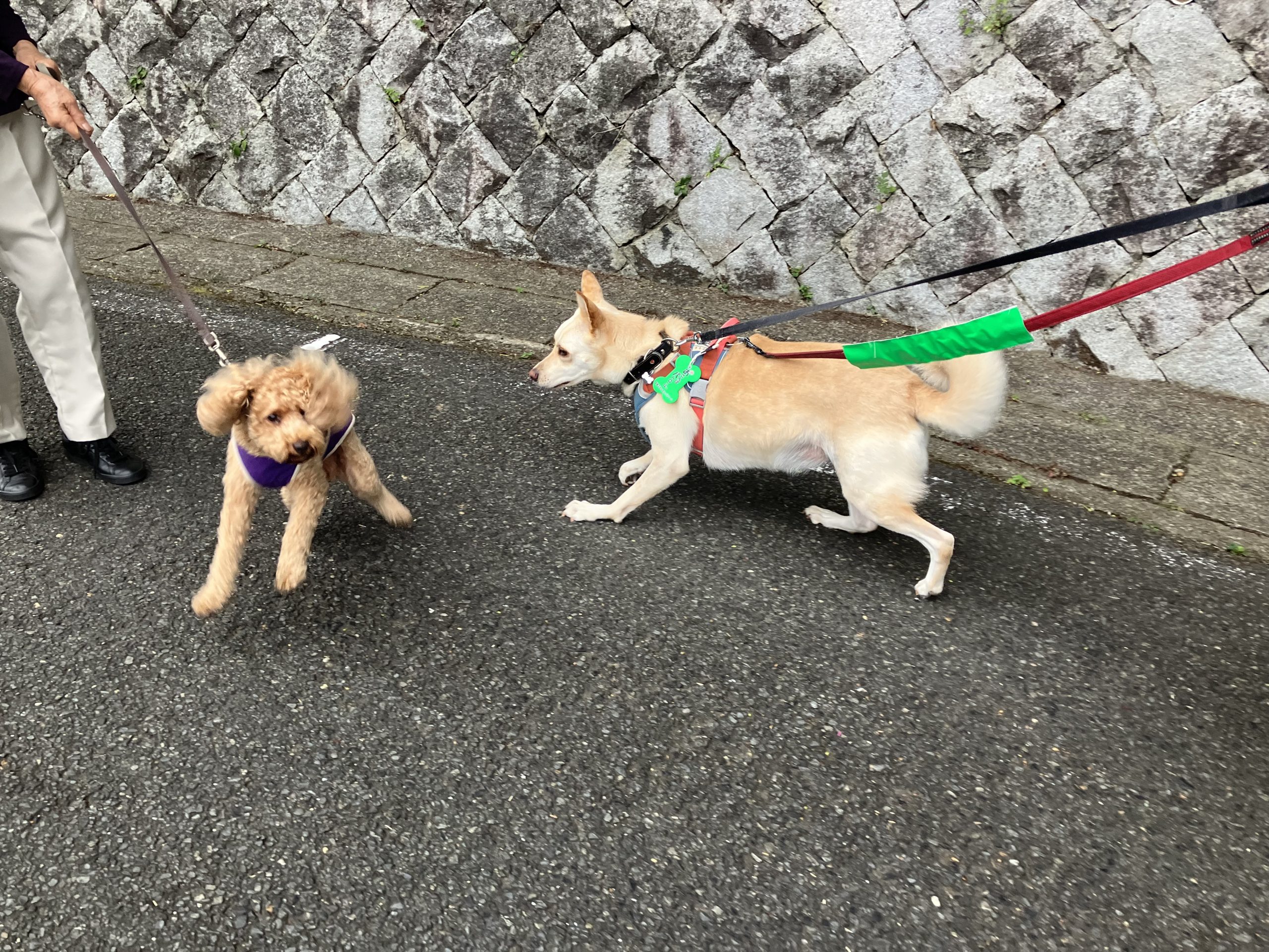 朝のお散歩ジジちゃんをビビらすハナちゃん。