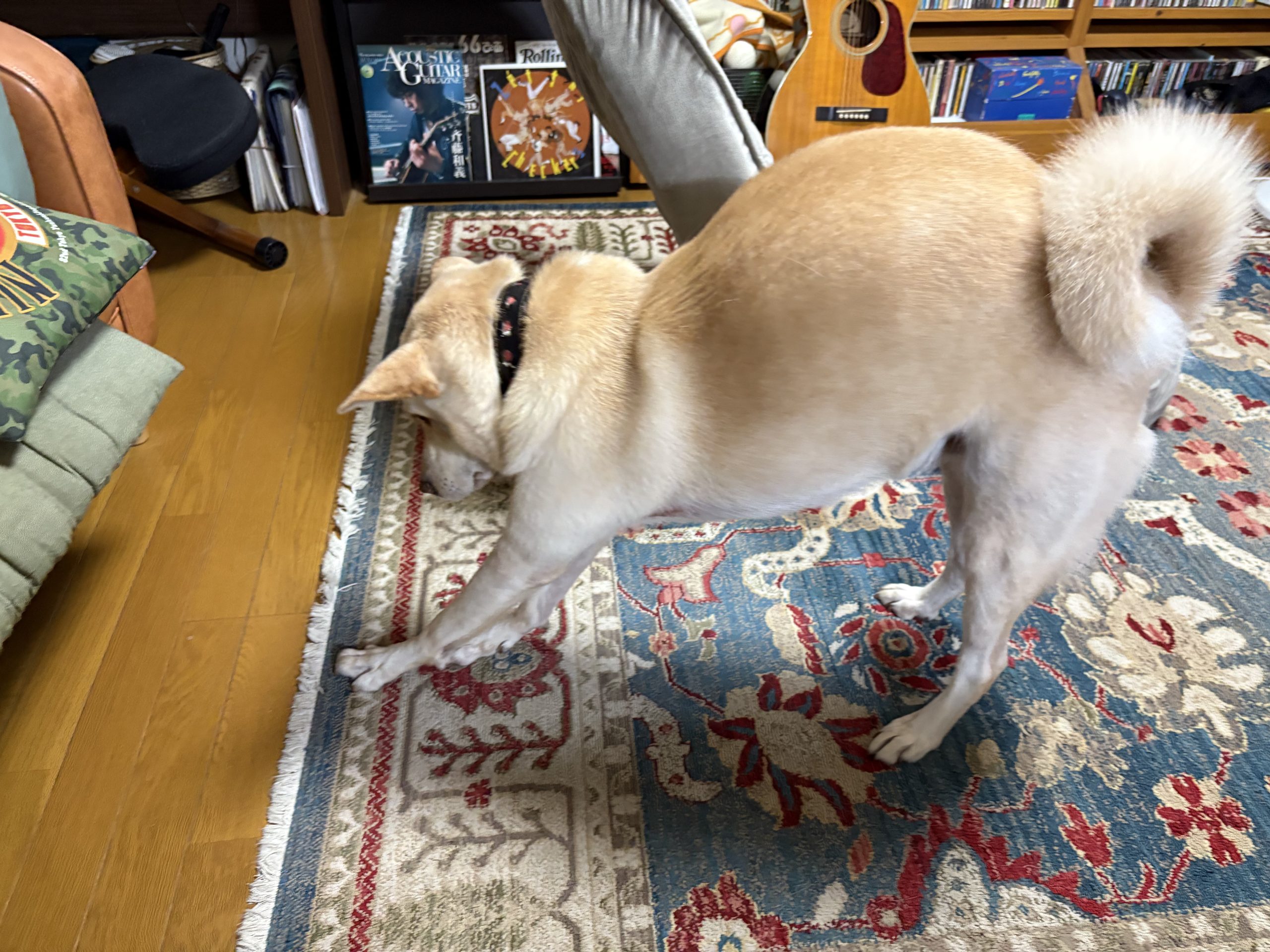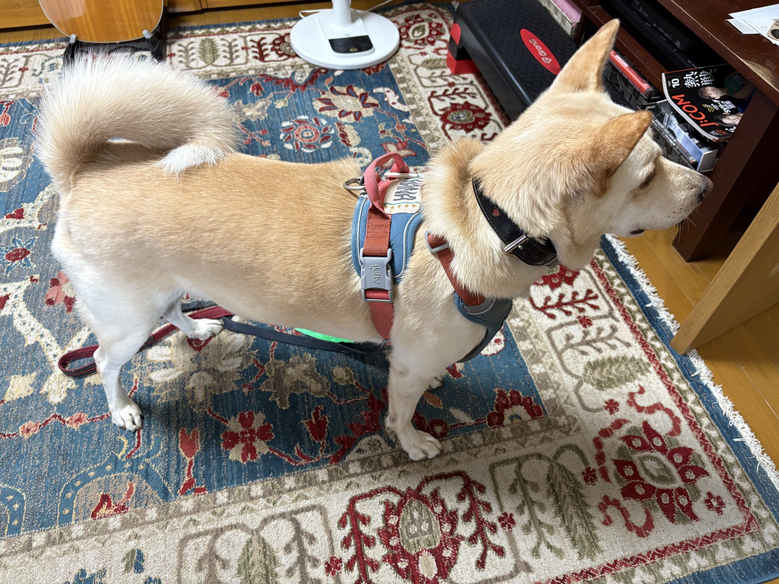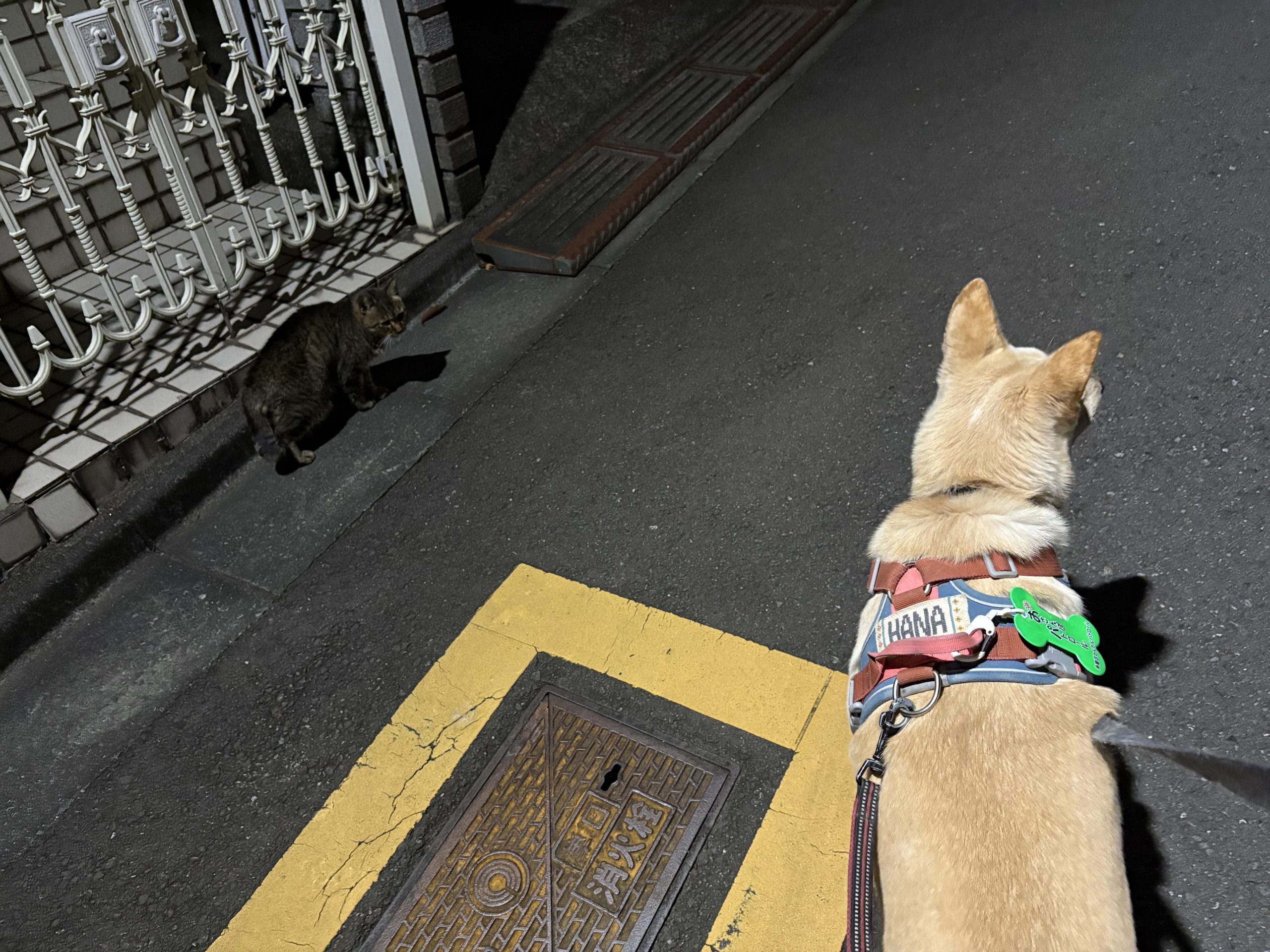 夜の散歩前、めんどくさそうに伸びをするハナちゃん。ママは帰って来ないのは分かってないと思われる。寝るときに気づくのでしょうか。