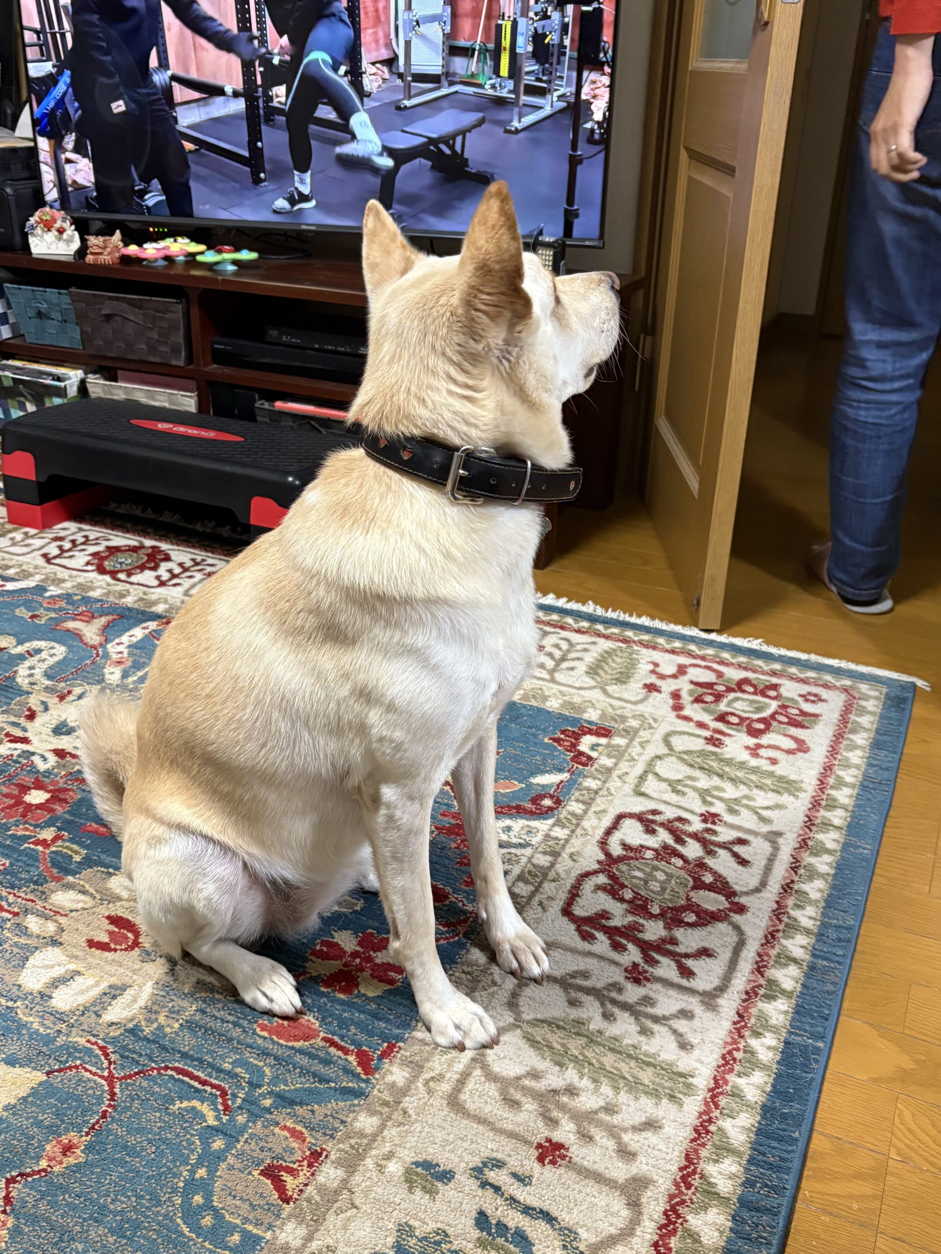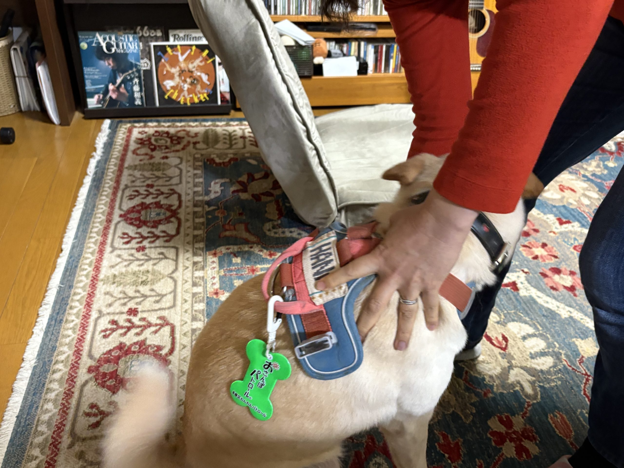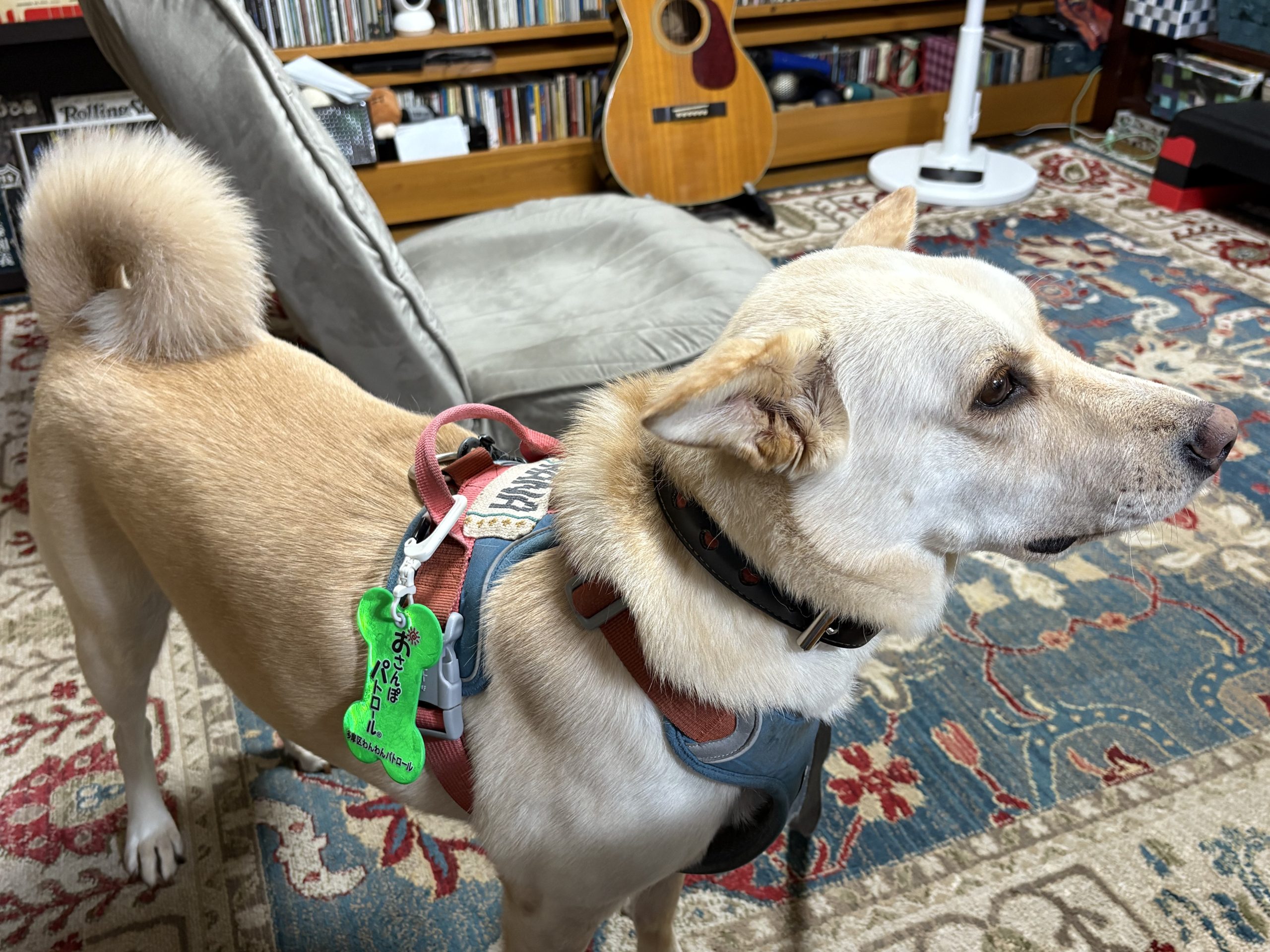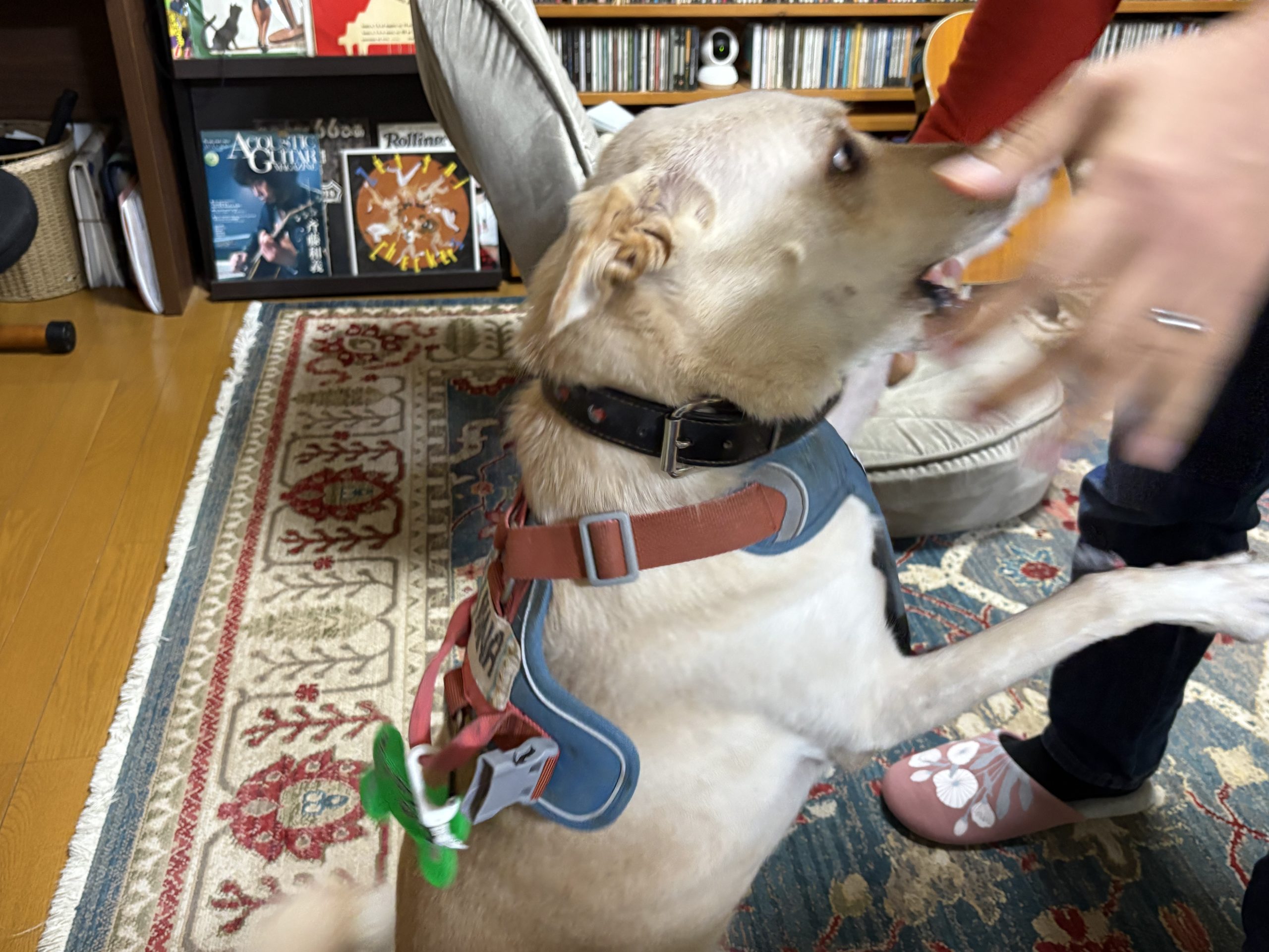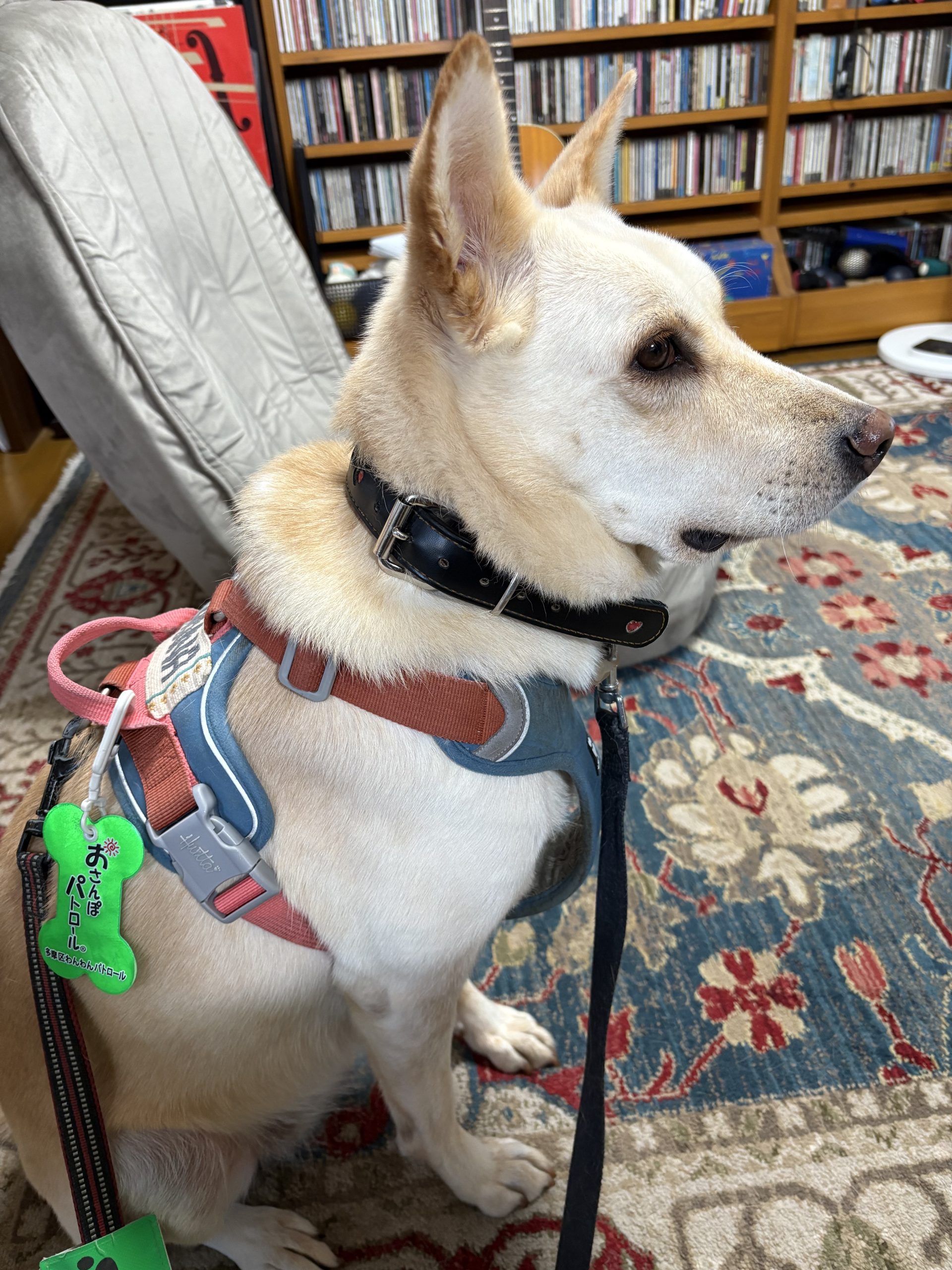 【ハナ*うちに来て4年272日目】散歩前格闘 ハナの日々 2025.11.05 朝の散歩待ちのハナちゃん。上の写真も朝の散歩でご機嫌さんでした。 夜の散歩前、ママが部屋から出ていったのでなんか期待外れな感じ。 ママが戻ってきて大喜びで大暴れ。目が怖いですが。動き回るので大格闘中です。 押さえ込み成功。のように見えますが、まだ装着できてません。 やっと完了。尻尾も「クルクル」で機嫌はいいみたいです。散歩中も友達犬2頭と挨拶できました。