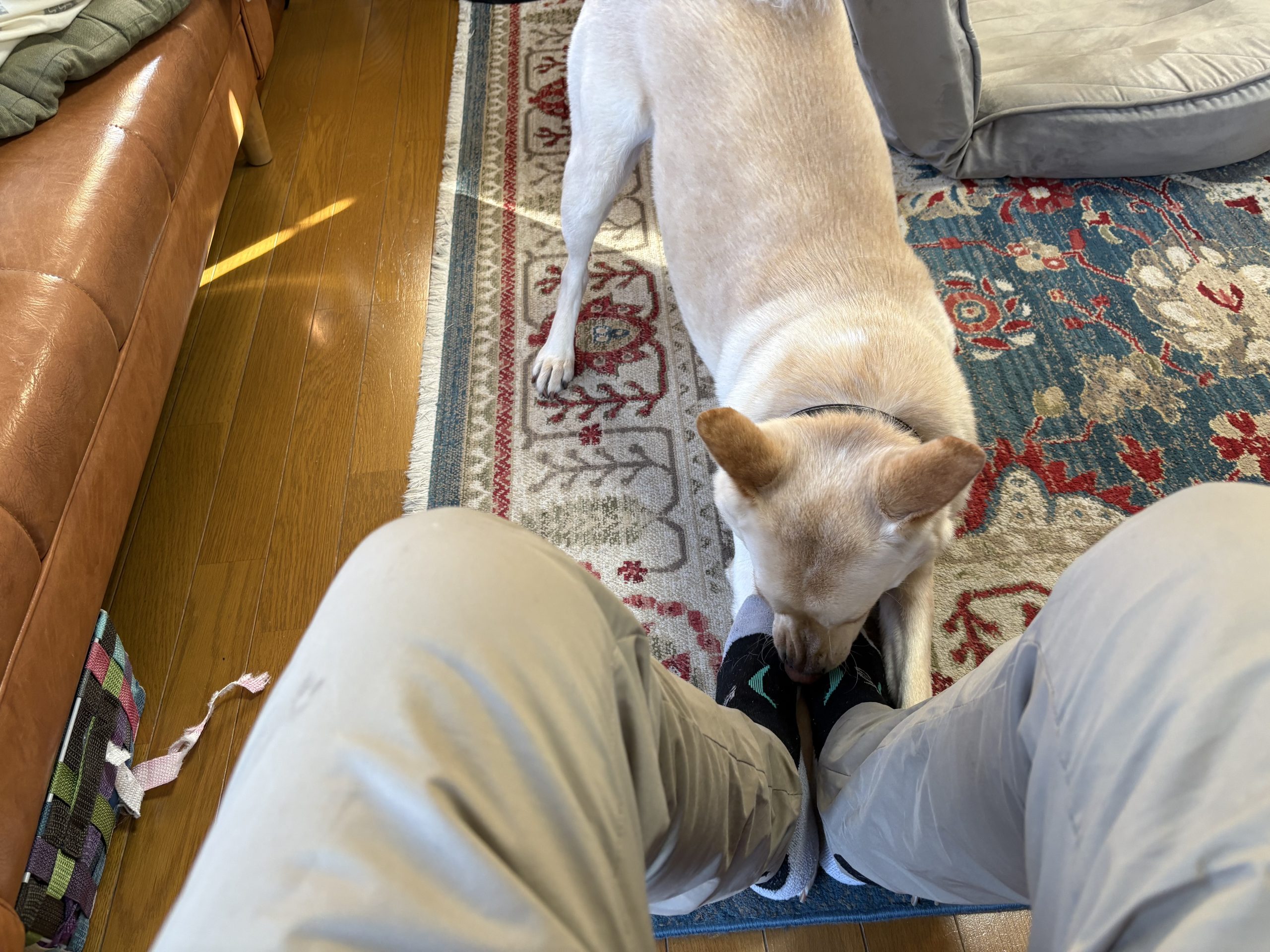 【ハナ*うちに来て4年356日目】寒い寒い ハナの日々 2026.01.30 朝も寒いなぁと思ったけど夜の方が寒かった。 昼に少し買い物に出て帰って来たところ。1時間も出てないのに、はしゃいで絡んできます。足の先をカジカジするんです。 ハナちゃん散歩行くよ!お、張り切ってんじゃん。 あ、また座りやがった!この後、無事に夜散歩に行きました。寒すぎて嫌だったのかしら。