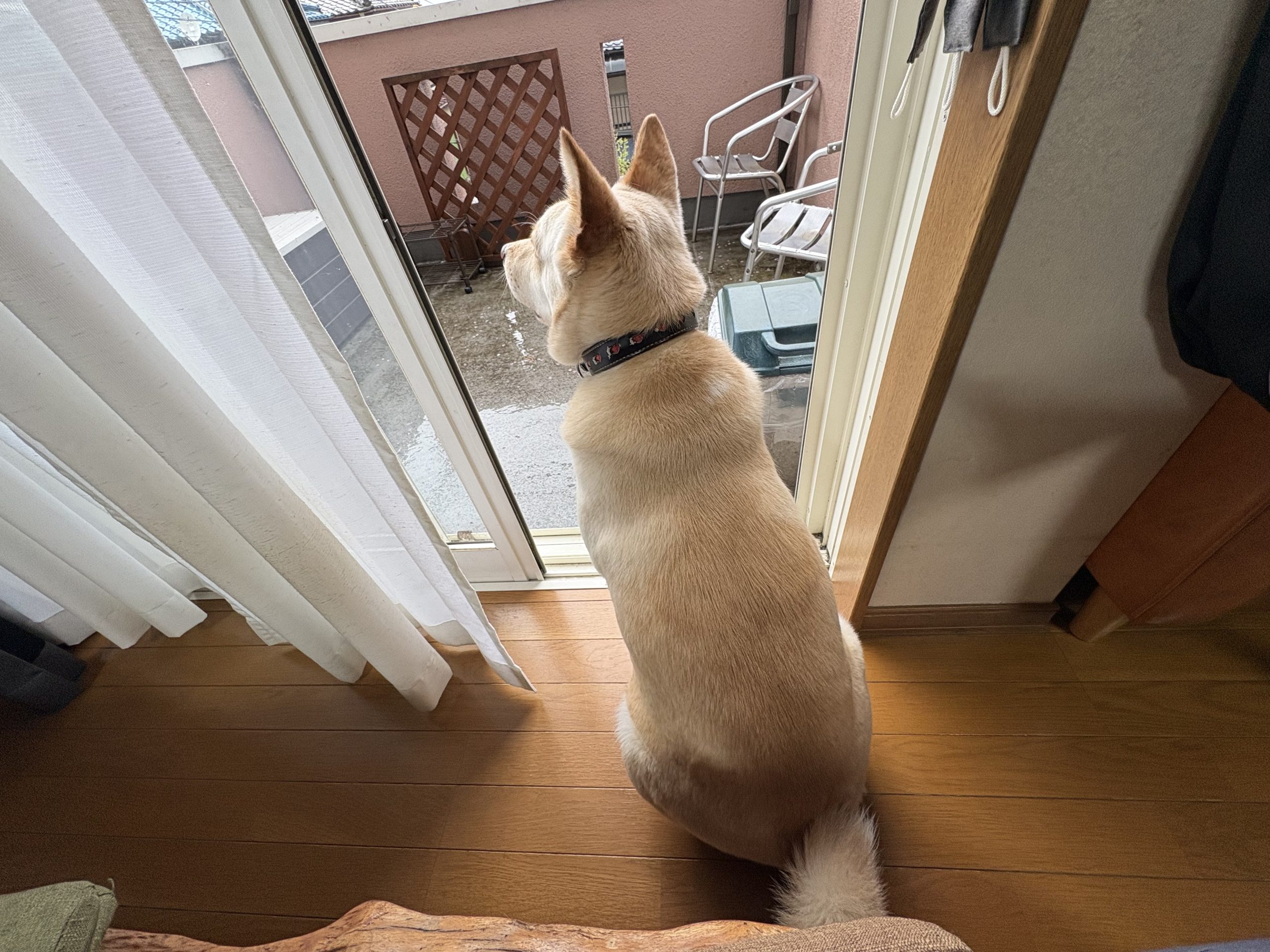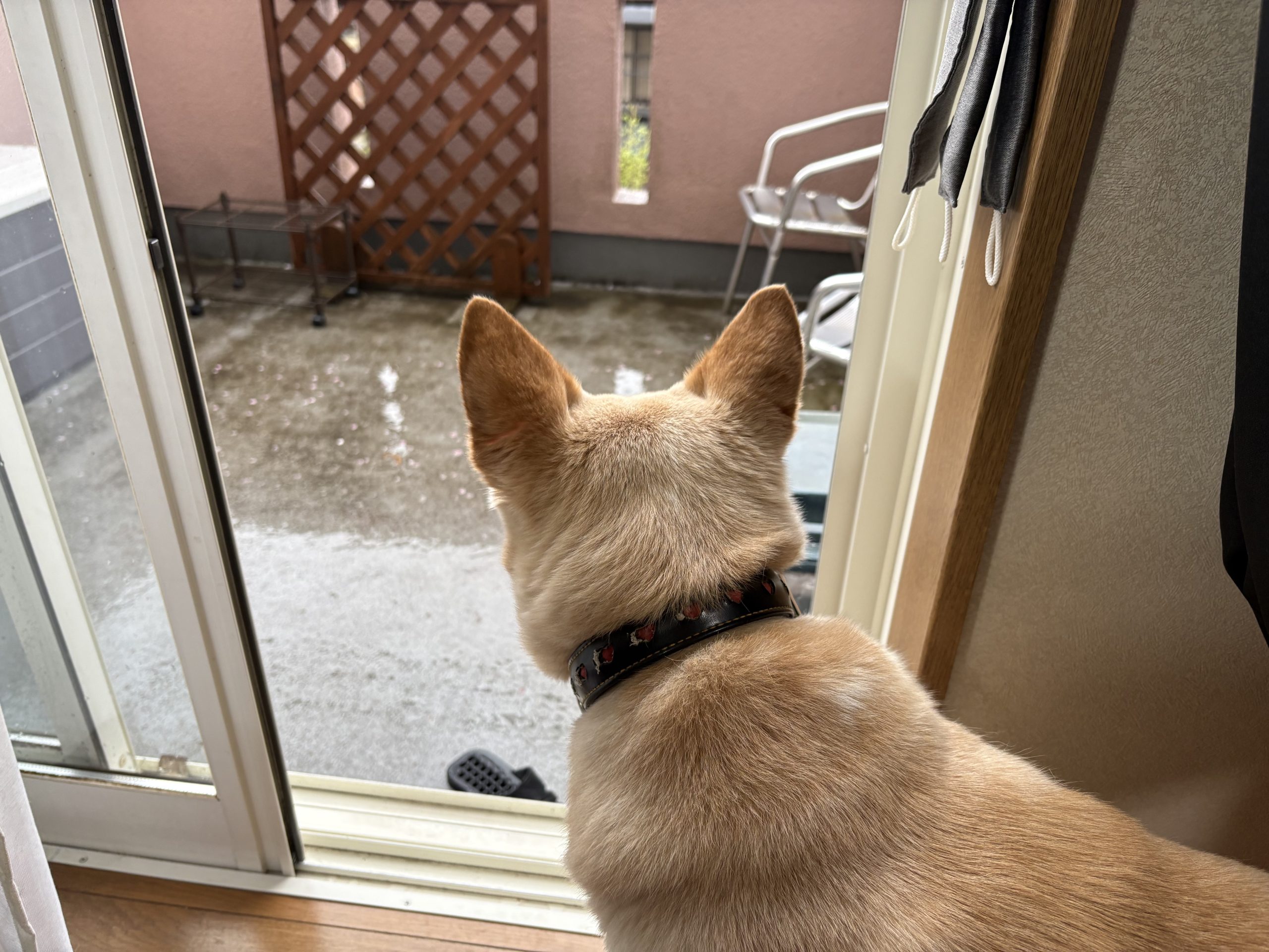 今朝は雨。お散歩行けずに外を眺めるハナちゃん