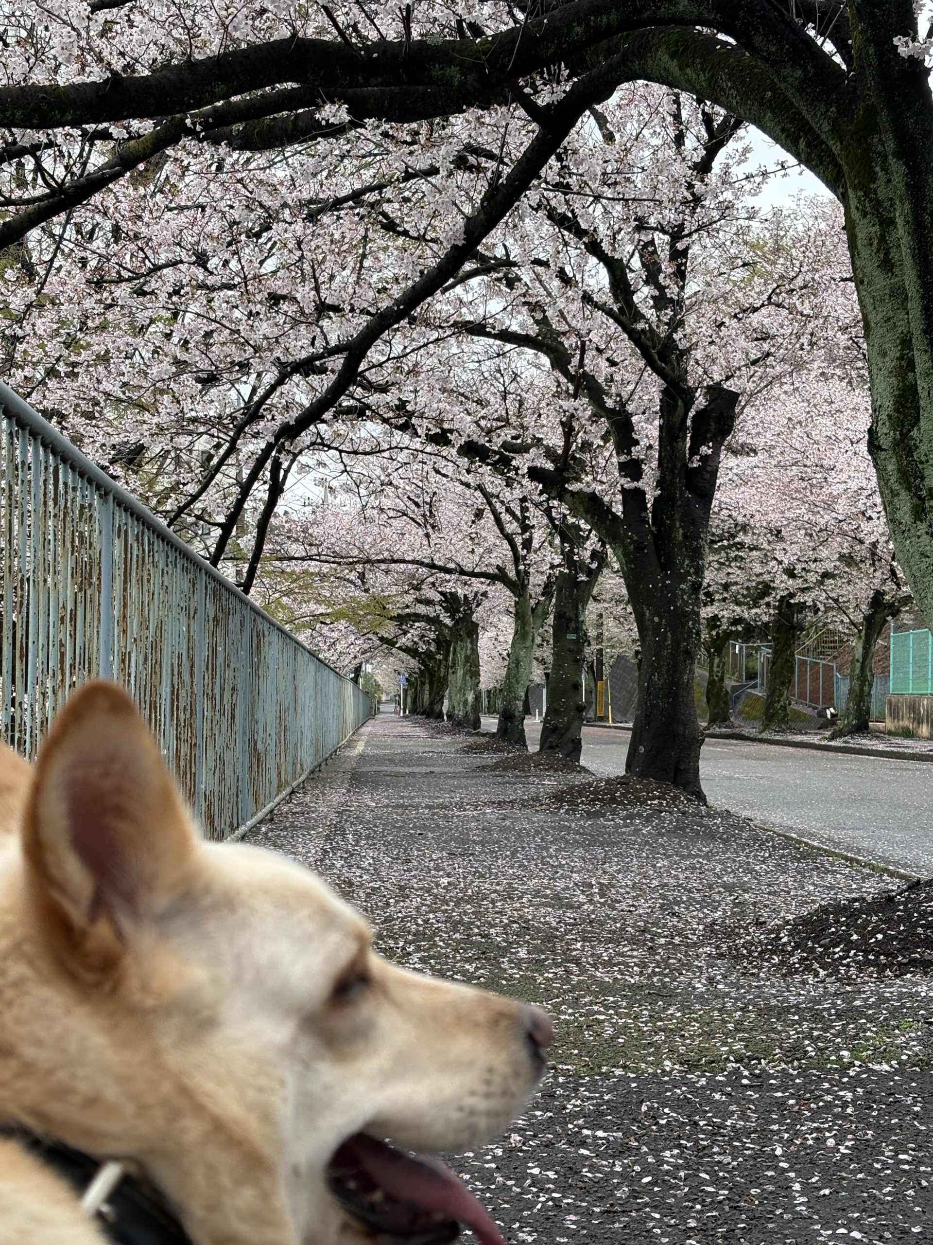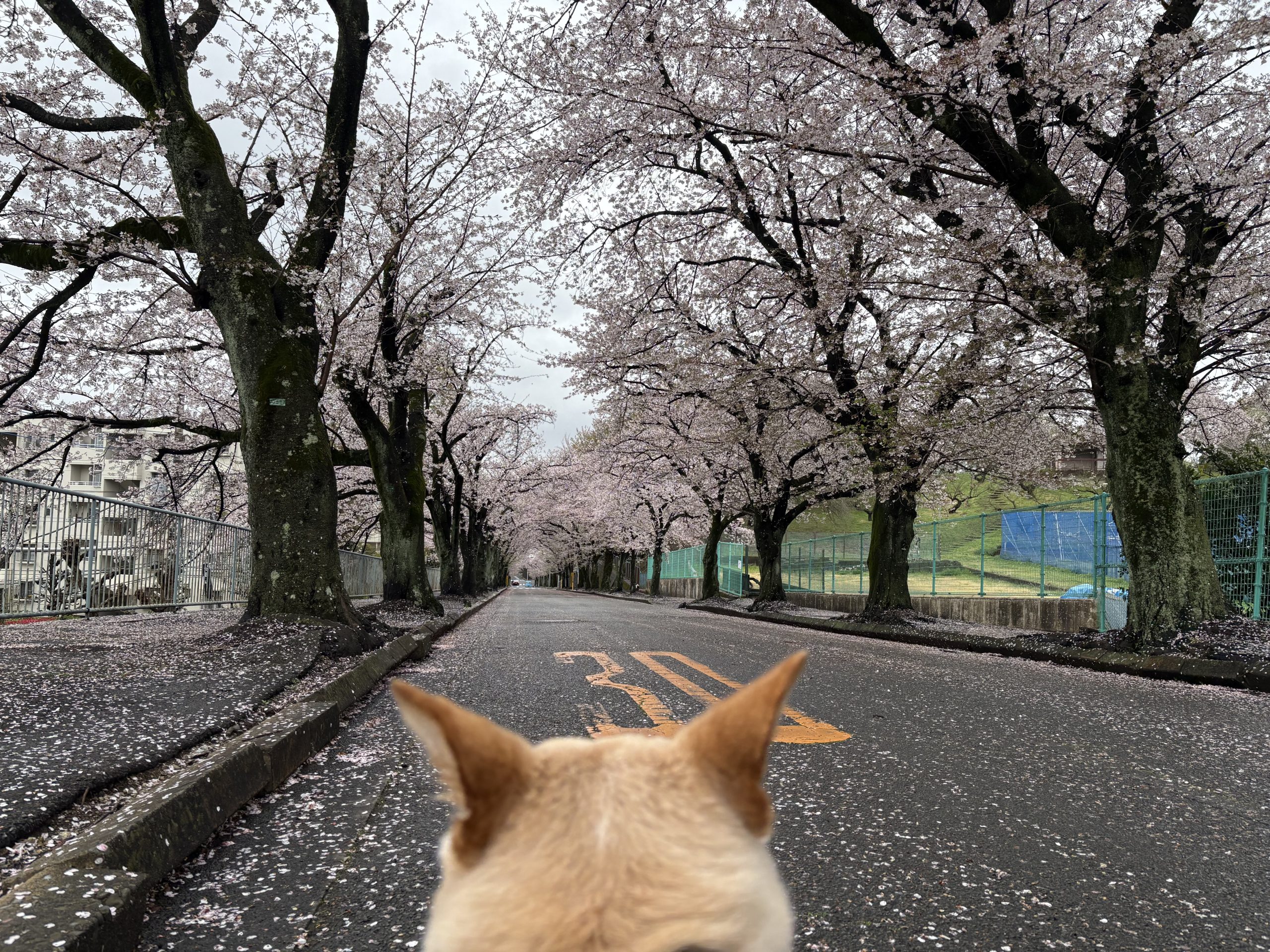 寒くなって、風が吹いてきたので桜の絨毯がどんどん広がってきます。